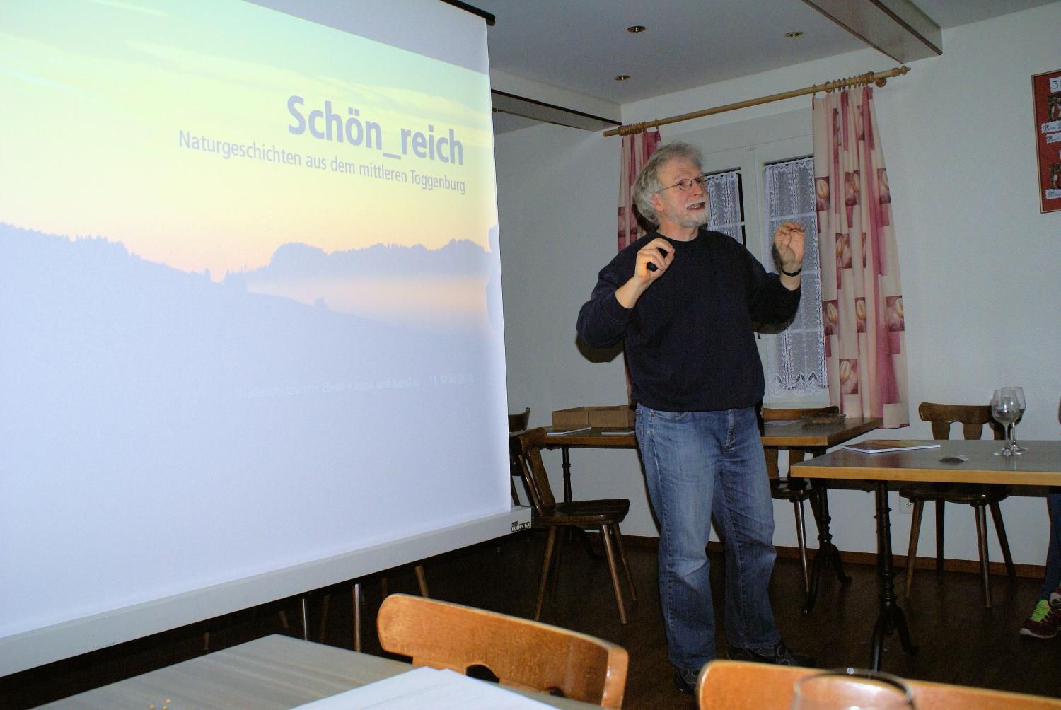 Nach dem Essen folgte ein spannender Vortrag von René Güttinger mit dem Titel «schön_reich, Naturgeschichten aus dem mittleren Toggenburg.» Der Toggenburger Biologe und Naturfotograf verwöhnte uns mit einem Bildervortrag der besonderen Art. Er erzählte informativ und sehr anschaulich vom Tierleben in unserer Kulturlandschaft. Aber auch vom Nebeneinander von Mensch und Tier im Zusammentreffen von Landwirtschaft, Siedlungen und Natur.