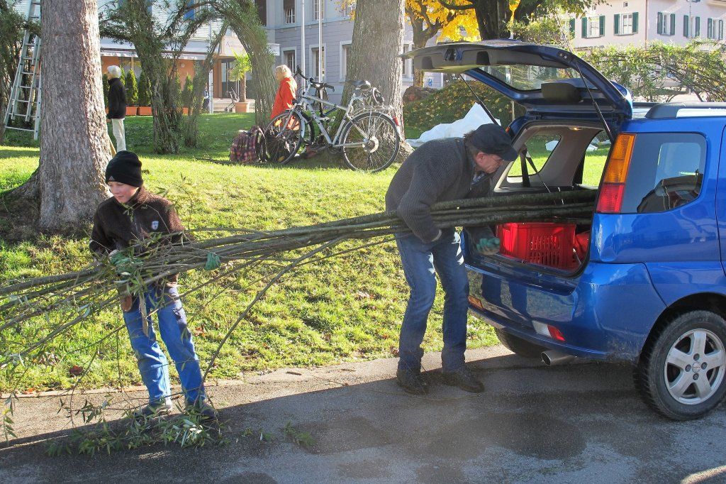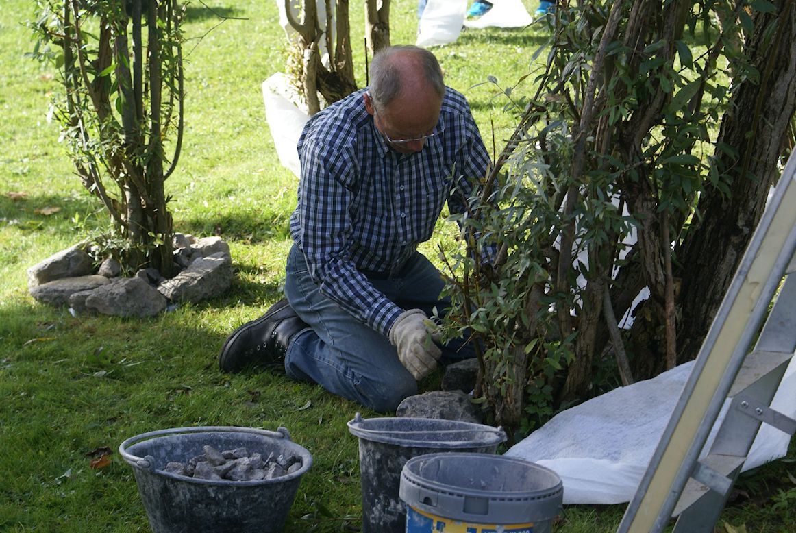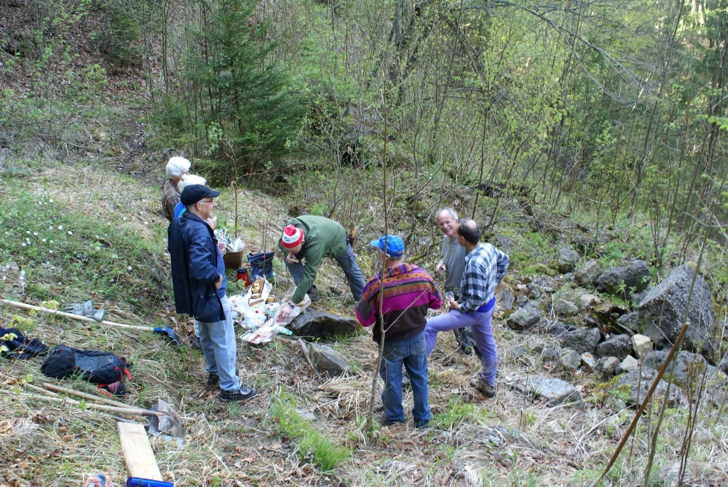 Kühl war es am Samstagmorgen, zum Glück aber trocken und das war für die Helferinnen und Helfer sehr angenehm. Eine angenehme Überraschung gelang übrigens auch unserem Vorstandsmitglied Ruth Jenni mit der reichhaltigen und liebevoll hergerichteten Zwischenverpflegung. Die Stärkung war auch nötig, denn nun galt es 1500 Kilogramm Steine um die 20 Pflanzstellen, zu schichten. Die Steine sind zweckmässig, weil sie die Pflege der Pflanzstellen und das Rasenschneiden erleichtern. Der ganze Erneuerungsaufwand war natürlich nur möglich, weil uns das Gartenbauunternehmen Roland Tschofen immer mit Jeep, Anhänger und guten Tipps unentgeltlich zur Seite stand.