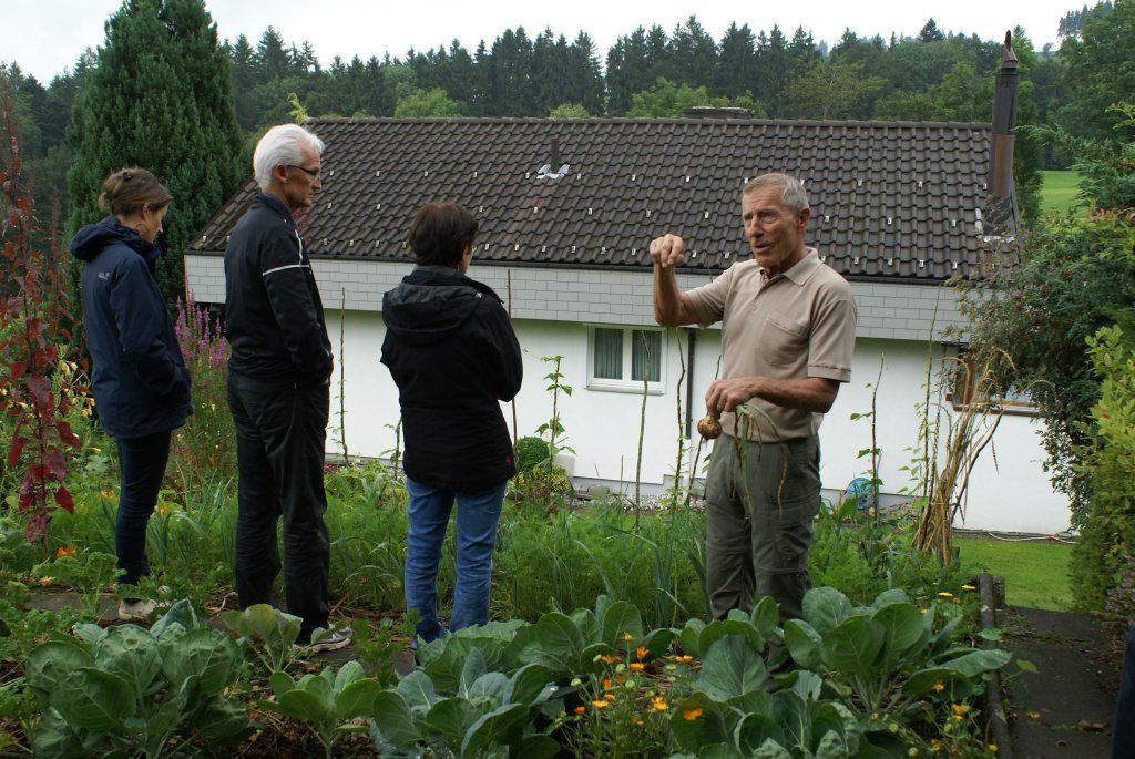 Sein Haus versteckt sich hinter einigem Grün, sodass es die Exkursionsgruppe im Herisauer Einfamilienhausquartier Saum zunächst kaum sieht. Doch Kurt Forster erscheint bald selber am Tor und hält Ausschau nach den Gästen, die er durch seinen Permakulturgarten führen wird. Vorbei an der Efeufront, am kleinen Marronibaum und am üppigen Waldrandgarten geleitet er die zwölf Teilnehmenden zum Sitzplatz, der ebenfalls von verschiedenen Pflanzen umrahmt ist. Dort möchte Forster, der von Beruf Sekundarlehrer war, aus seinen Erfahrungen mit der Permakultur erzählen.